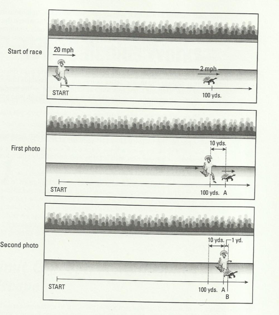 The first snapshot is the instant Achilles reaches the point where the tortoise started. By the time Achilles gets there, the tortoise has raced forward and is now 10 yards ahead of Achilles (remember, the tortoise moves a tenth as fast as Achilles, so in the time it takes Achilles to travel 100 yards, the tortoise covers a tenth as much ground, or 10 yards).